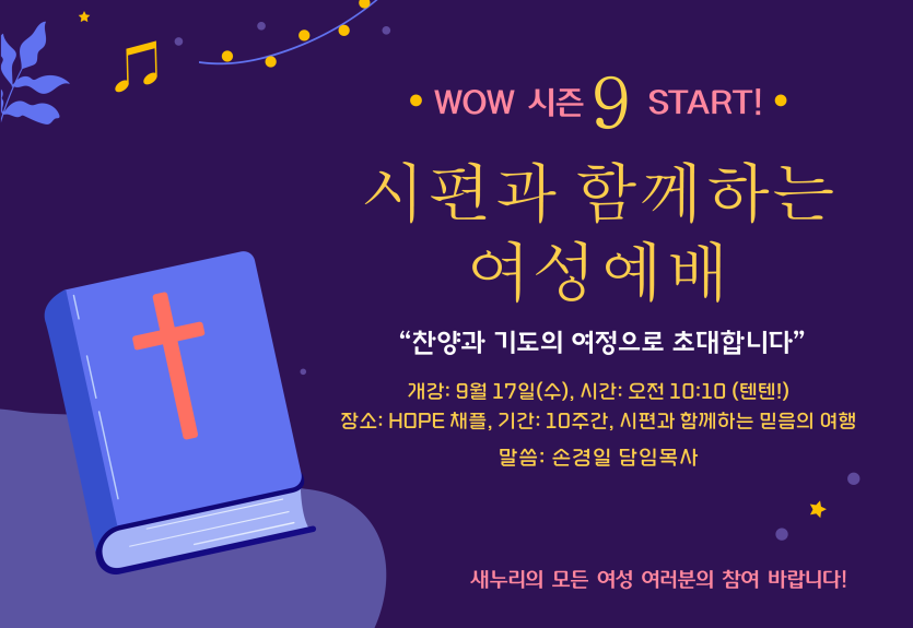 WOW 시즌9 여성예배 페이지 정보 작성자 NCBC 조회 25회 작성일 25-08-29 21:41 목록 본문 이전글다락방 철야 기도회 25.09.12 다음글Saenuri Youth Orchestra & Choir - Fall 2025 25.08.22 댓글 0 댓글목록 등록된 댓글이 없습니다. 목록