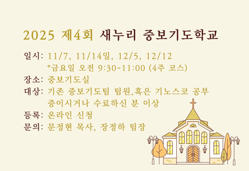 제 4회 새누리 중보기도학교 페이지 정보 작성자 NCBC 조회 20회 작성일 25-10-31 21:32 목록 본문 관련링크 https://docs.google.com/forms/d/e/1FAIpQLSc4_b0ZstvNl9WE62vJzGVH1zFyrb… 9회 연결 이전글여성예배 종강파티 25.11.14 다음글아둘람 형제모임 25.10.17 댓글 0 댓글목록 등록된 댓글이 없습니다. 목록